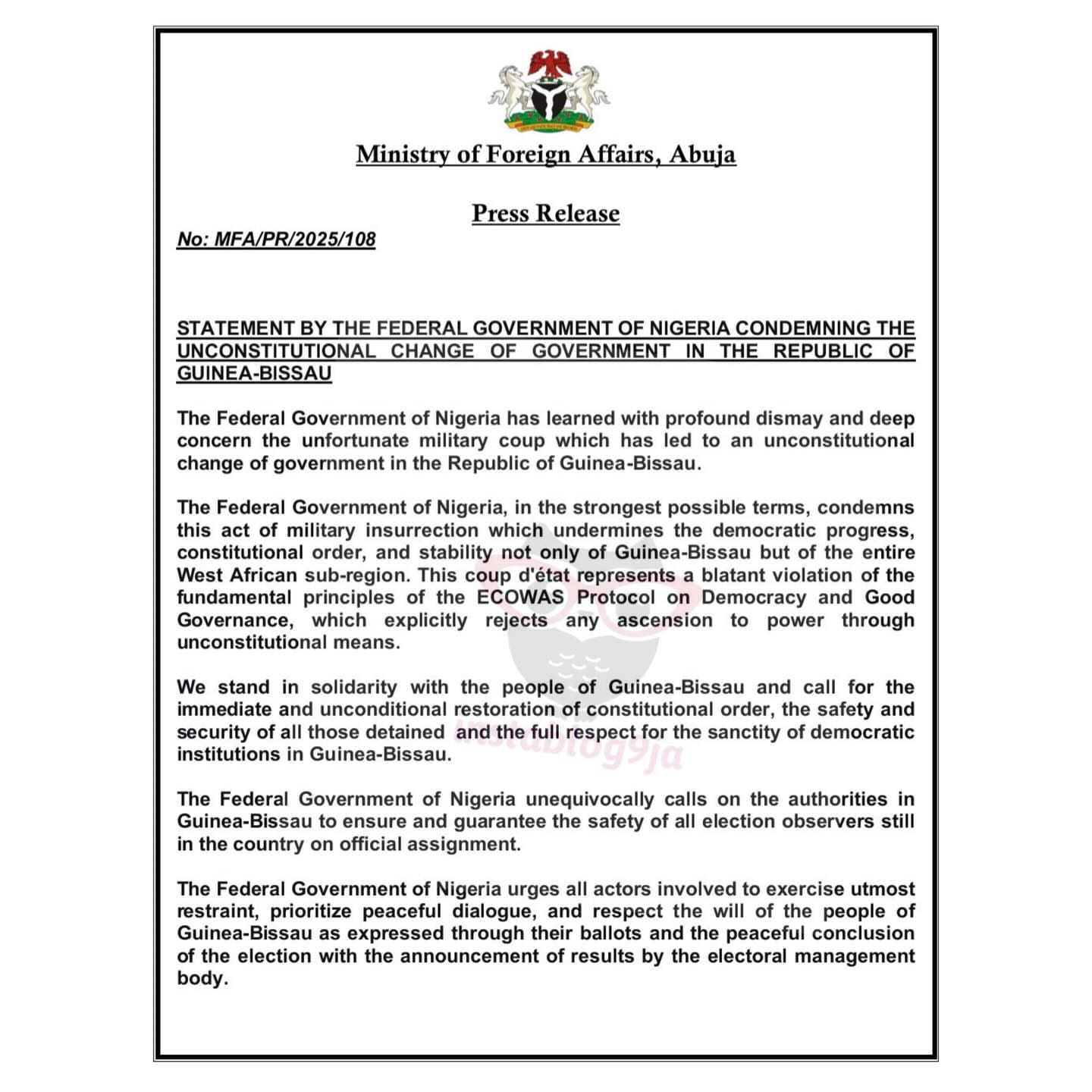 The statement, released by the Ministry of Foreign Affairs, stressed that Nigeria does not recognize any military-led change of government and stands fully behind the democratic process in Guinea-Bissau.