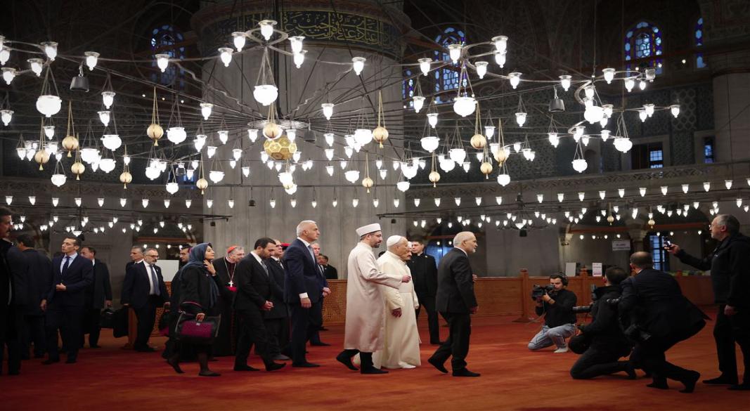Before the delay, the Pope visited the Blue Mosque, one of Türkiye’s most historic religious landmarks. He was received by Imam Asgin Tunca along with senior mosque guides who escorted him through the complex. The Pope removed his shoes, walked quietly across the carpets, and listened as the imam explained the history and design of the 17th-century structure. According to officials present, the Pope chose not to pray inside the mosque, instead offering a brief moment of silent reflection as he toured the main hall.